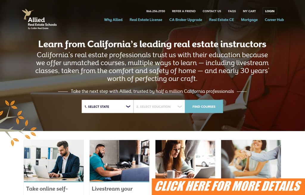 Allied Schools has been the top choice for real estate agents in California for a long time and it’s easy to see why. They are owned by Colibri Real Estate now, but people who have been using Allied Schools for their real estate courses will be able to return to a familiar name.
