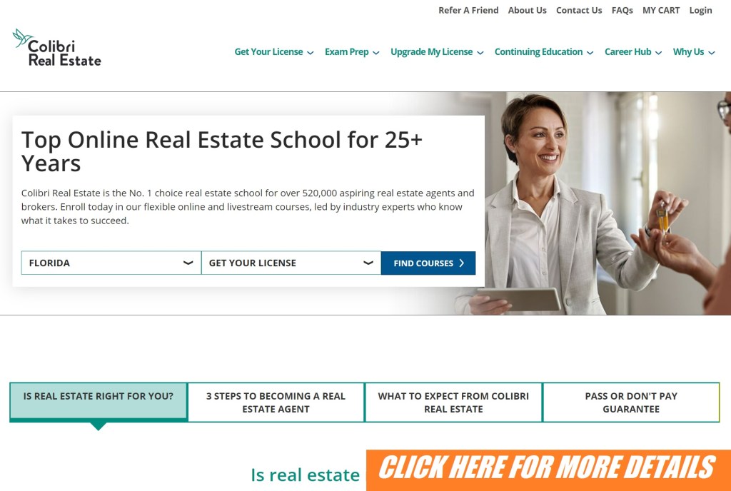 Colibri Real Estate is the biggest and arguably the most comprehensive real estate school in the industry. They offer every course you will ever need throughout your entire real estate career and then some. They are one of the few schools to offer a live video course, where you can watch the instructor from the comfort of your home. This program is perfect for people who want to have a more interactive experience.